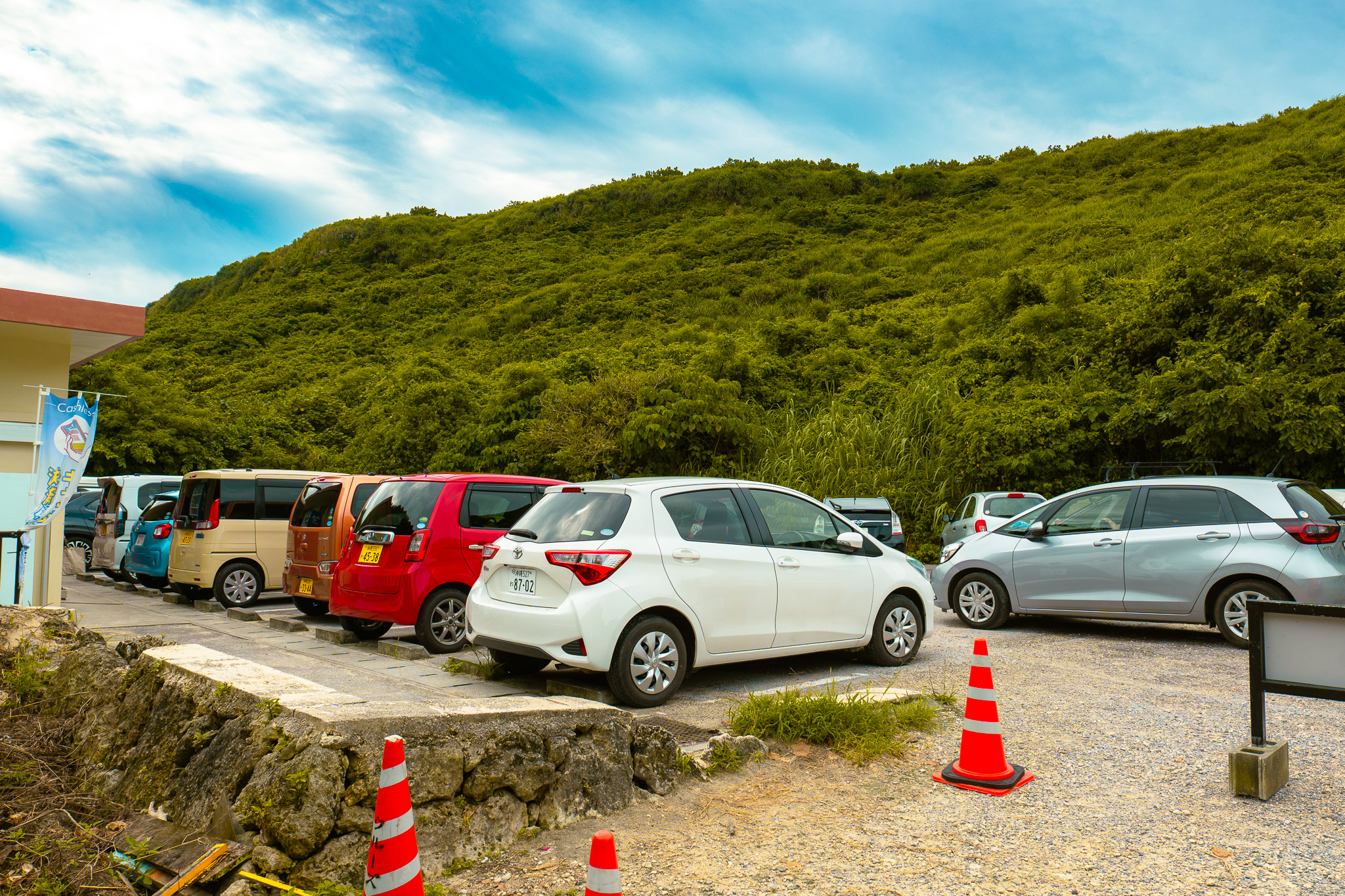 렌트카로 83번 국도를 달리다 보면 코발트 블루 바다가 시야에 들어옵니다. 그 풍경에 눈을 뺏긴 사이, 비치로 향하는 내리막길이 나와요. 조금만 더 내려가면 무료 주차장이 있어요. 성수기에는 인근 유료 주차장도 이용할 수 있어요.