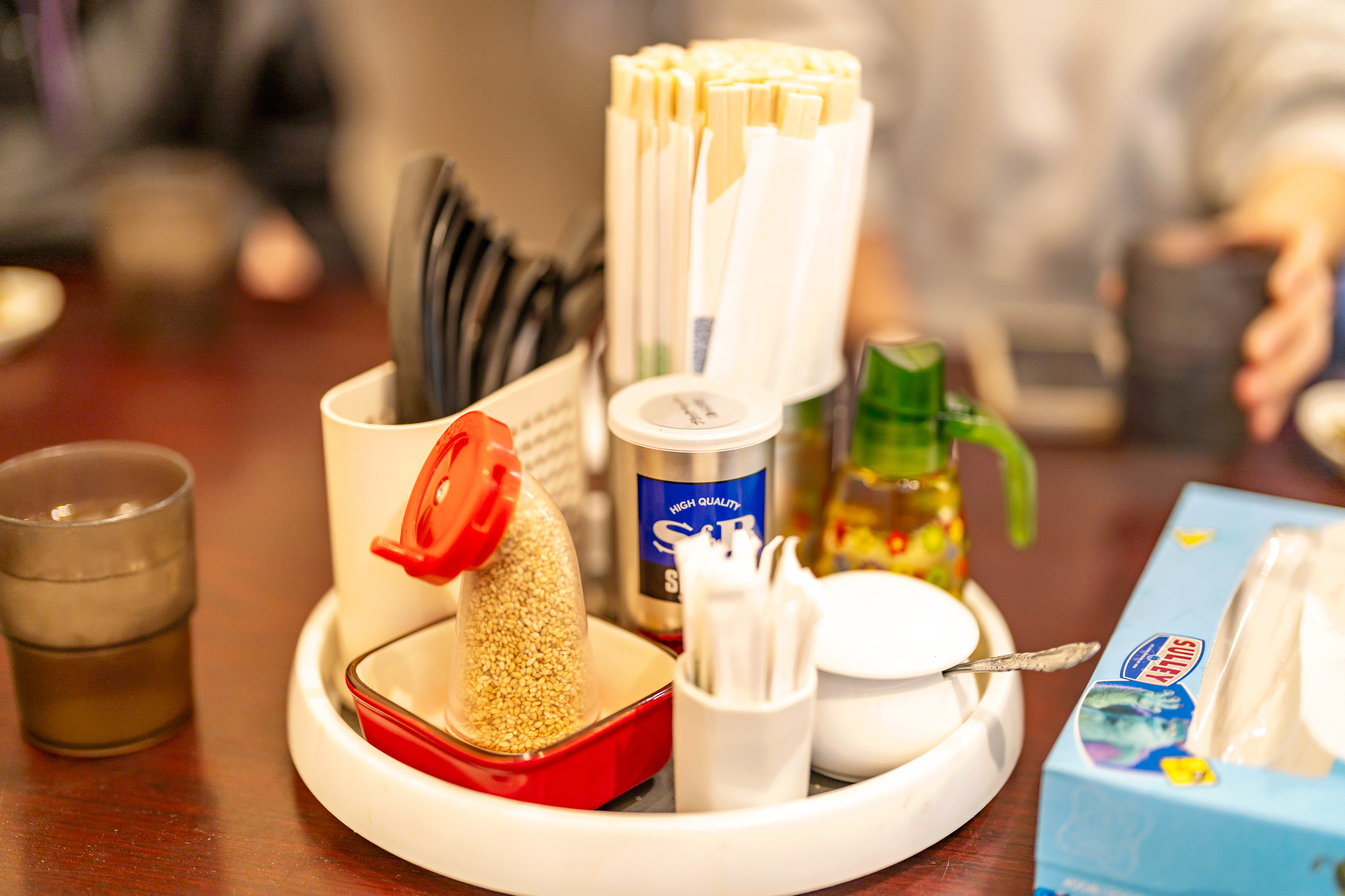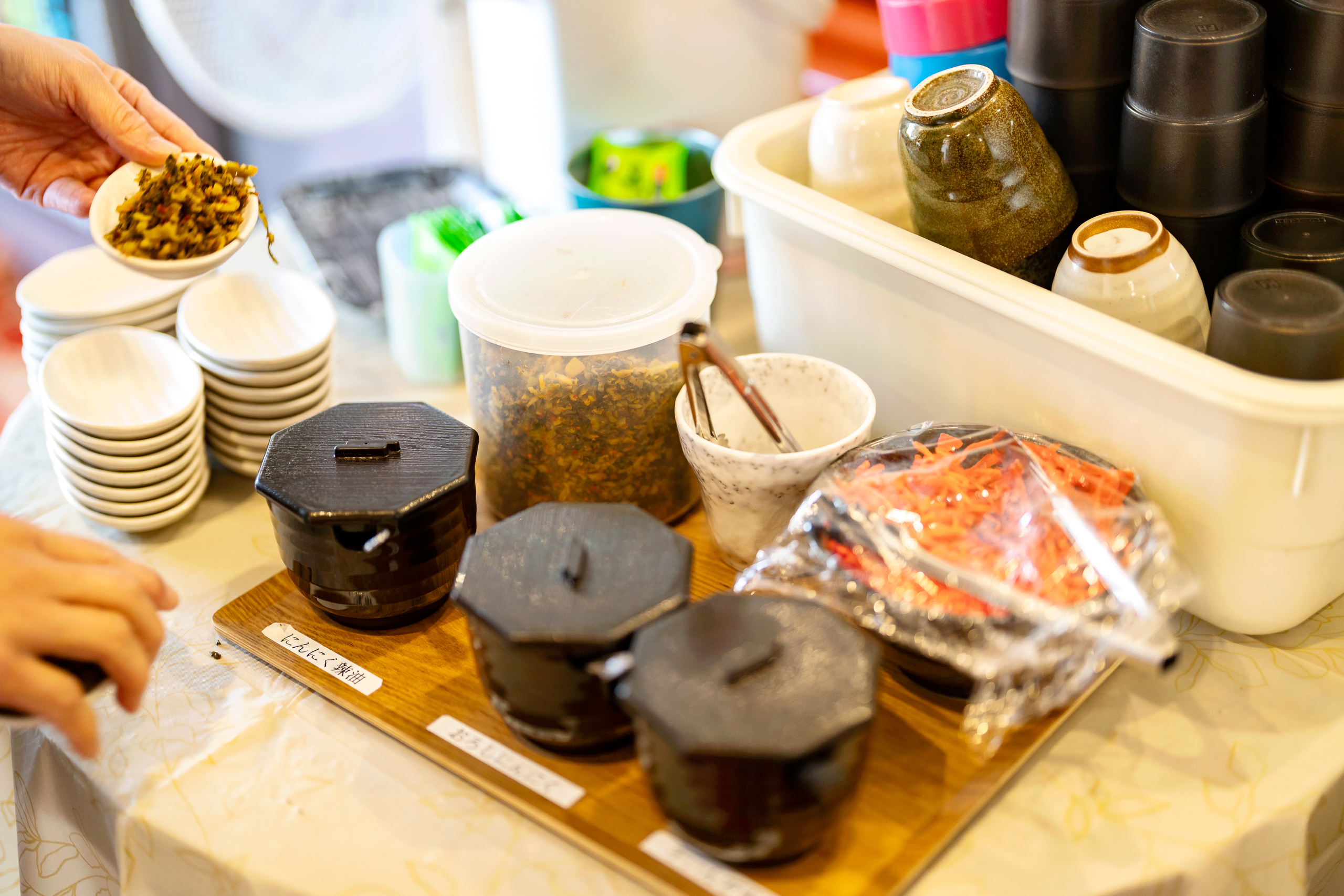 자리에 앉으면 테이블 위에 식사에 필요한 것들도 준비되어 있고 매운 양념이나 생강, 마늘 등 여러분의 라멘 맛을 커스터마이징 가능한 것들도 셀프로 즐길 수 있습니다. 물은 셀프이므로 한잔 떠가시길 바랍니다.